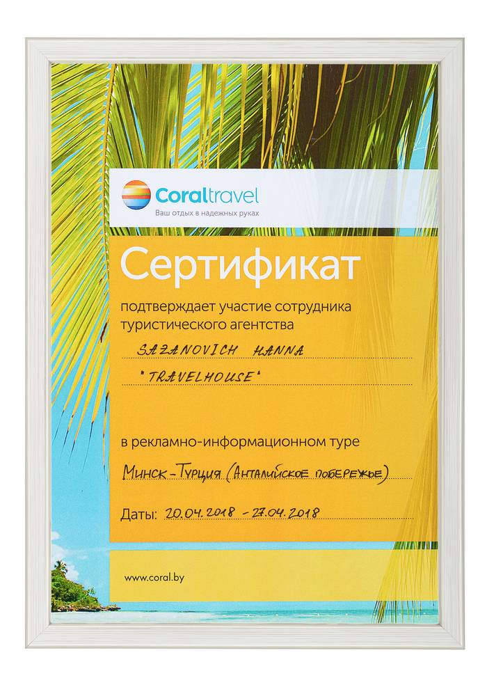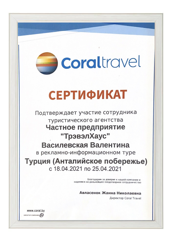 Сертификат соответствия № BY/112 04.03. 071.01 00109 выдан ГУ «Национальное агентство по туризму» Министерства спорта и туризма Республики Беларусь. Компания Travel House прошла добровольную сертификацию услуг. Ежегодно аудиторы ГУ «Национальное агентство по туризму» проверяют офисы продаж, уровень квалификации специалистов компании, внутреннюю документацию, договоры оказания туристических услуг, стандарты работы и подтверждают соответствие услуг компании актуальным требованиям Закона о туризме и другому законодательству Республики Беларусь.